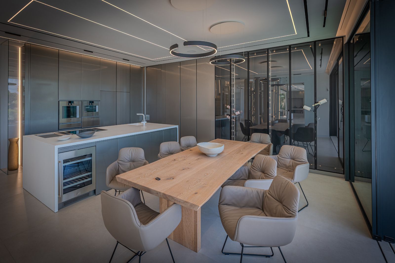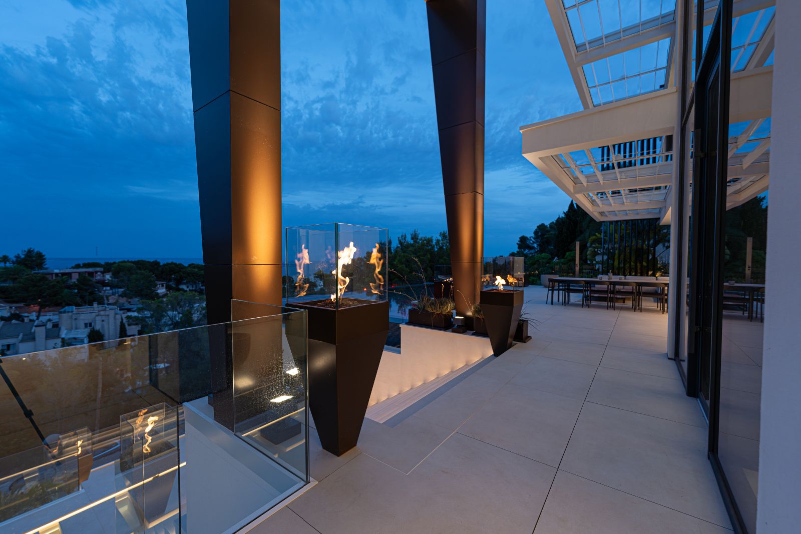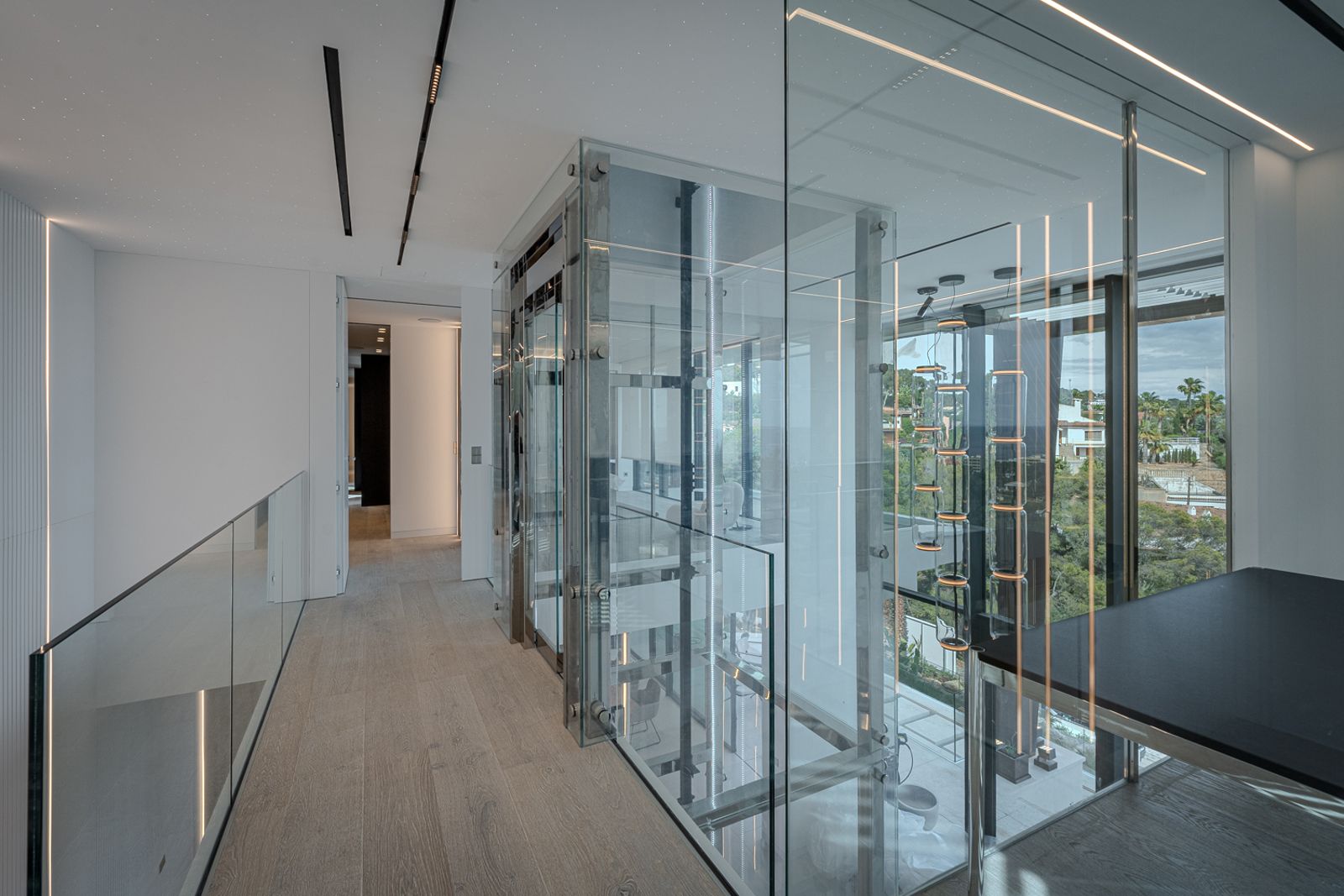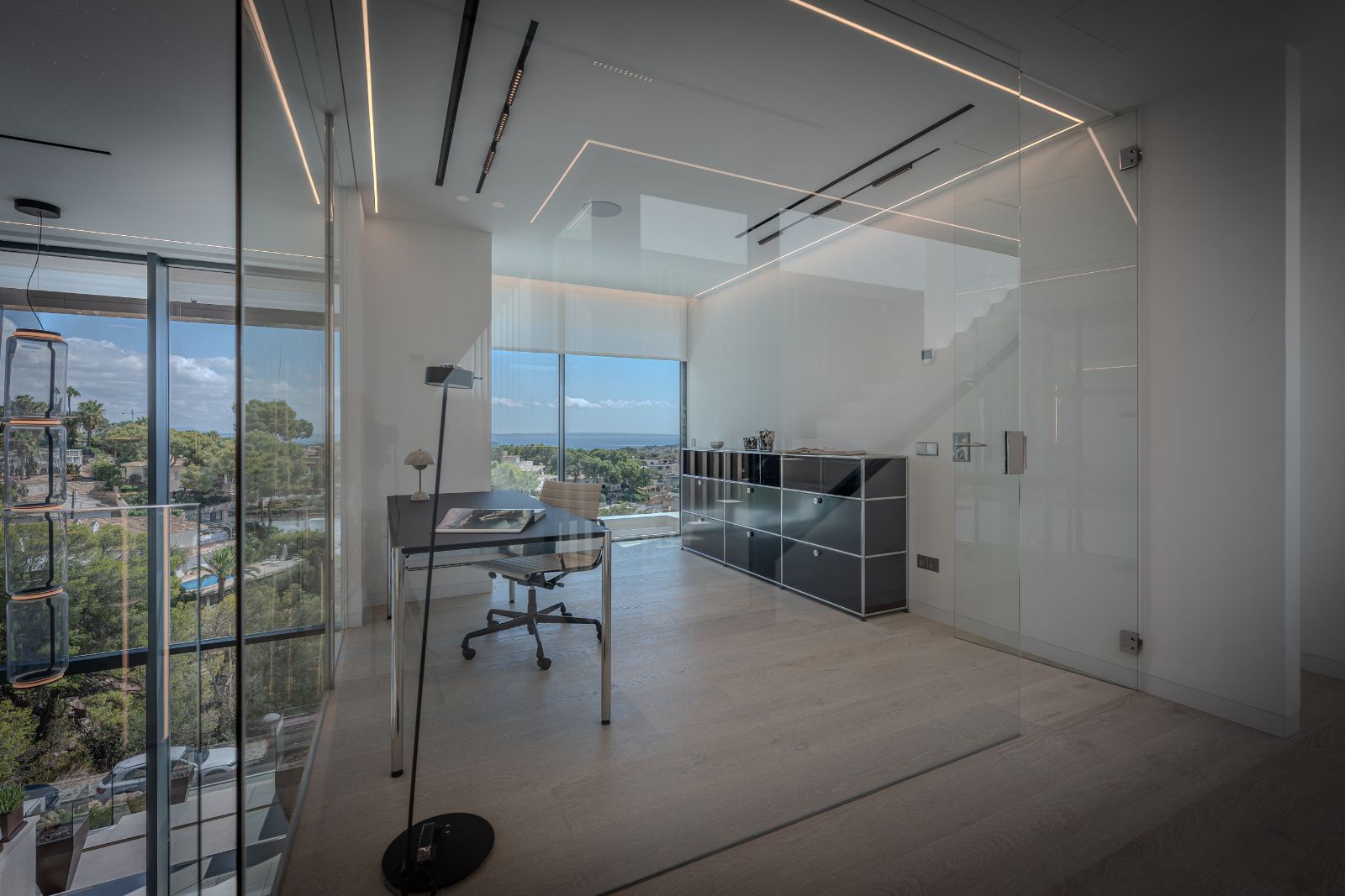 Diese Luxusvilla in Costa d’en Blanes besticht durch ihr Design und ihren spektakulären, 6,50 m hohen Eingangsbereich, der von Fackeln beleuchtet wird, einen Thyssen-Glasaufzug sowie eine Dachterrasse mit Jacuzzi, BBQ-Bereich, Bar und Feuerlounge. Mit 643 m2 Wohnfläche bietet sie 4 Schlafzimmer – eines davon als unabhängiges Gästeapartment mit eigenem Zugang – sowie 6 Bäder, verglastes Büro, Wohnzimmer und Küche mit Gaggenau-Elektrogeräten und Weinkühlschrank, die eine 2. Serviceküche verbirgt. Zudem verfügt die Villa über einen Spa-Bereich mit Sauna und Dampfbad, Fitnessstudio mit Fenster zum Pool, Garage für 6 Fahrzeuge und Vorbereitung für ein Home-Cinema. Ausgestattet ist sie mit Aluminiumfenstern, Fußbodenheizungm Klimaanlage, Lufterfrischungssystem und Domotik.