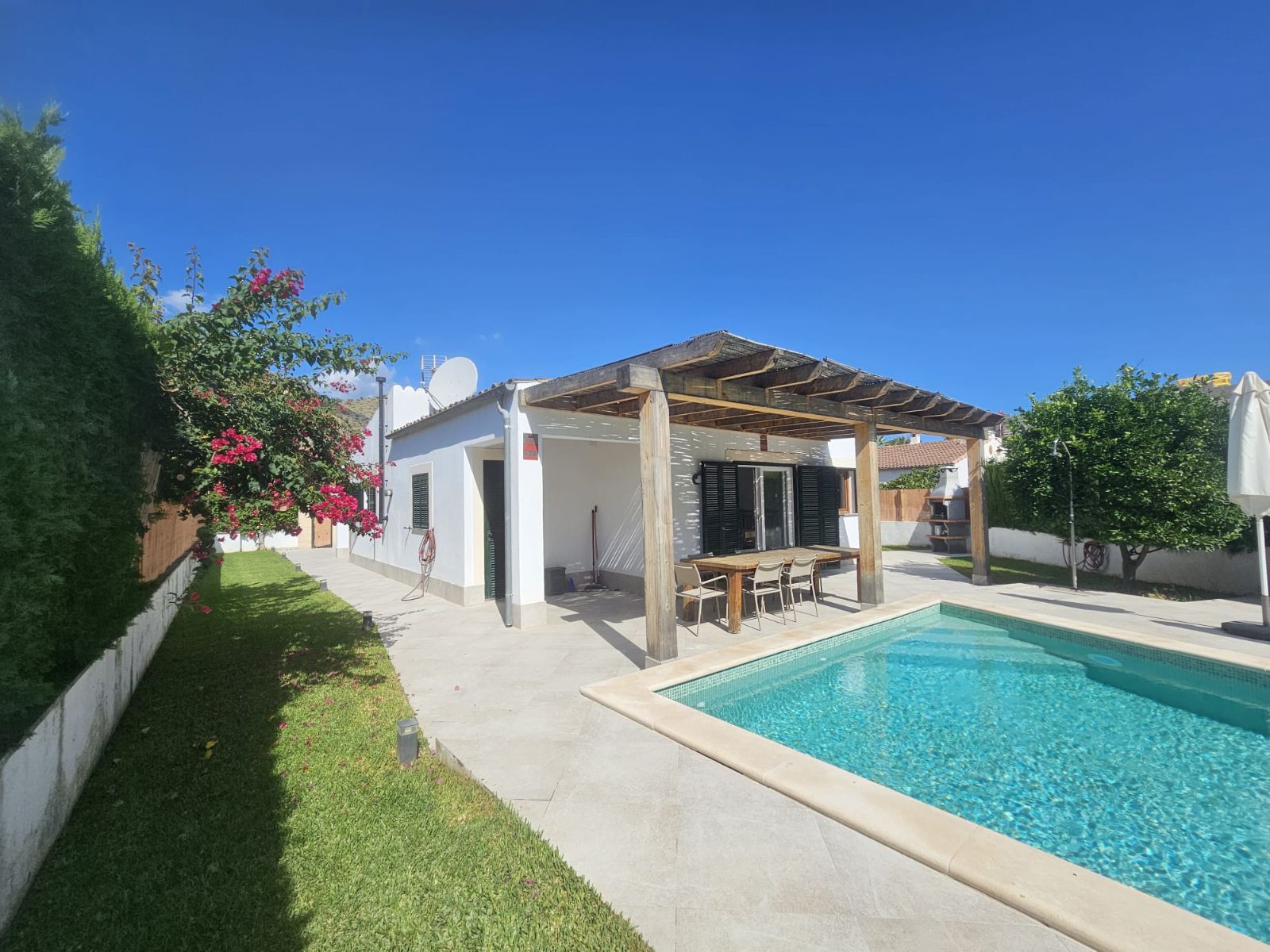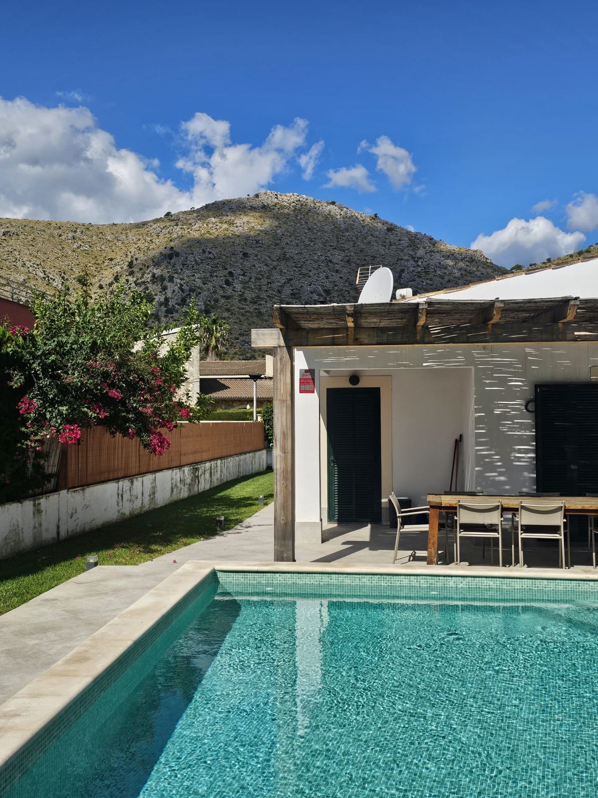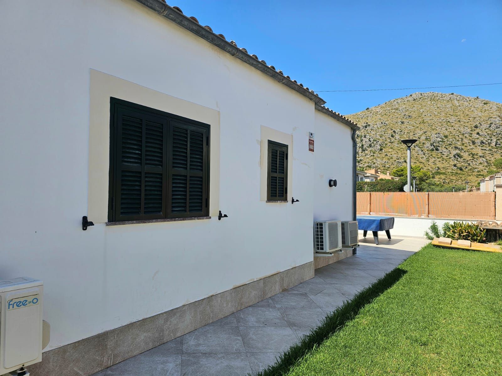 3 bedrooms, 2 bathrooms, an open-plan living and dining area, kitchen with large laundry and storage room, and a pool with terraces and barbecue: This renovated 116 m2 villa in Puerto Alcudia is entirely on the ground floor and offers plenty of space for the whole family. The villa is equipped with Climalit double-glazed windows, air conditioning, underfloor heating in the bathrooms, pellet stove, fitted wardrobes, driveway parking and alarm system and has a holiday rental licence (ETV). The beautiful view of the Puig de Sant Martí is omnipresent in the garden and it is also not far to the beach.