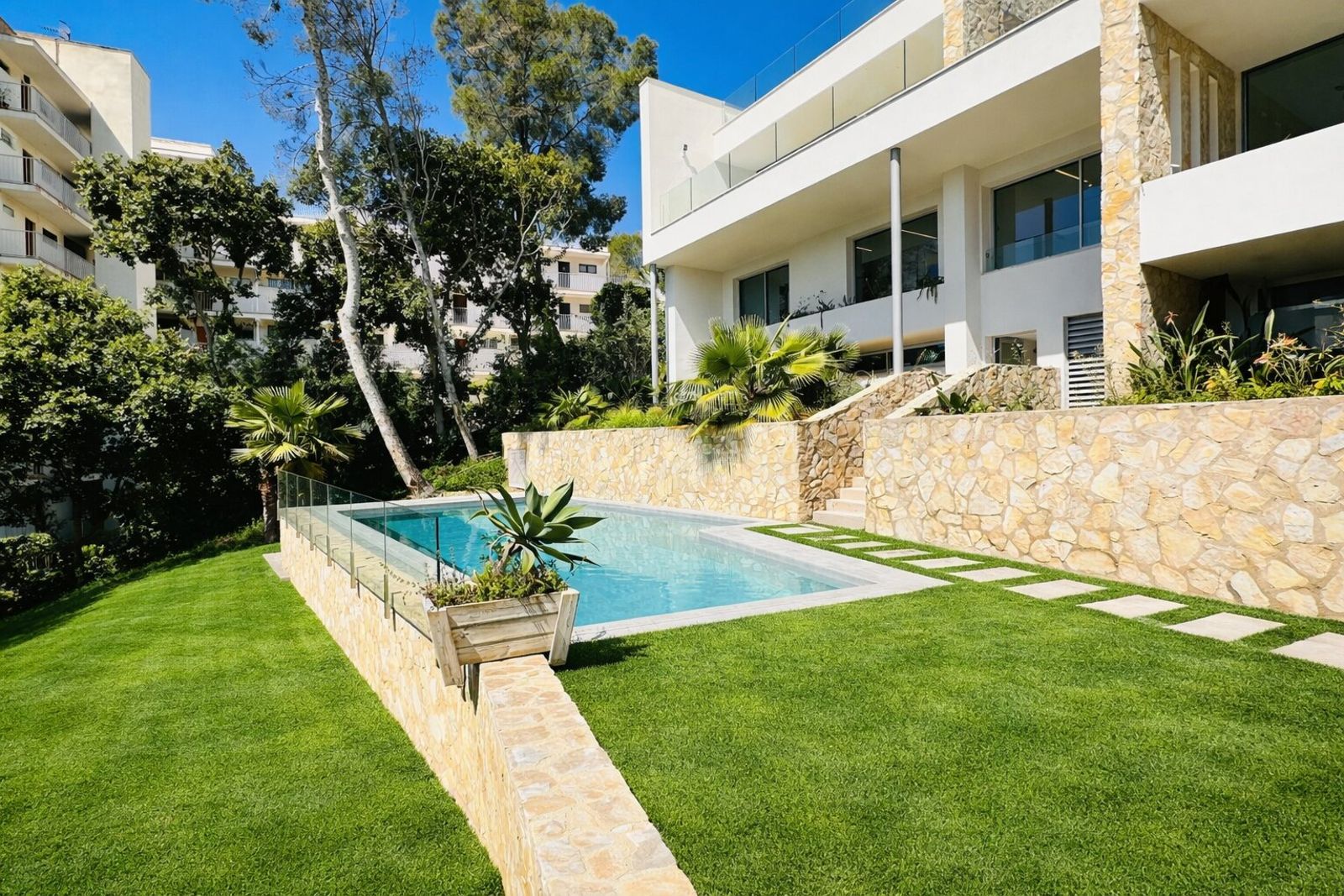Nueva construcción: En Ciutat Jardín - Coll d'en Rabassa en Palma de Mallorca, se construye este fantástico complejo residencial con piscina, en el que, entre otros, se venden amplios apartamentos en planta baja con 96 m2 superficie habitable. Se distribuye en 2 dormitorios dobles, 2 baños, salón abierto con comedor y cocina, porche de 1,20 m2 y lavadero. Además, se incluye una plaza de aparcamiento con preinstalación para carga eléctrica y aprox. 3 m2 de trastero. Los acabados de alta calidad incluyen cocina con electrodomésticos, vestidor y dos armarios empotrados, climatización central por aerotermia y baldosas de porcelana de gran formato.