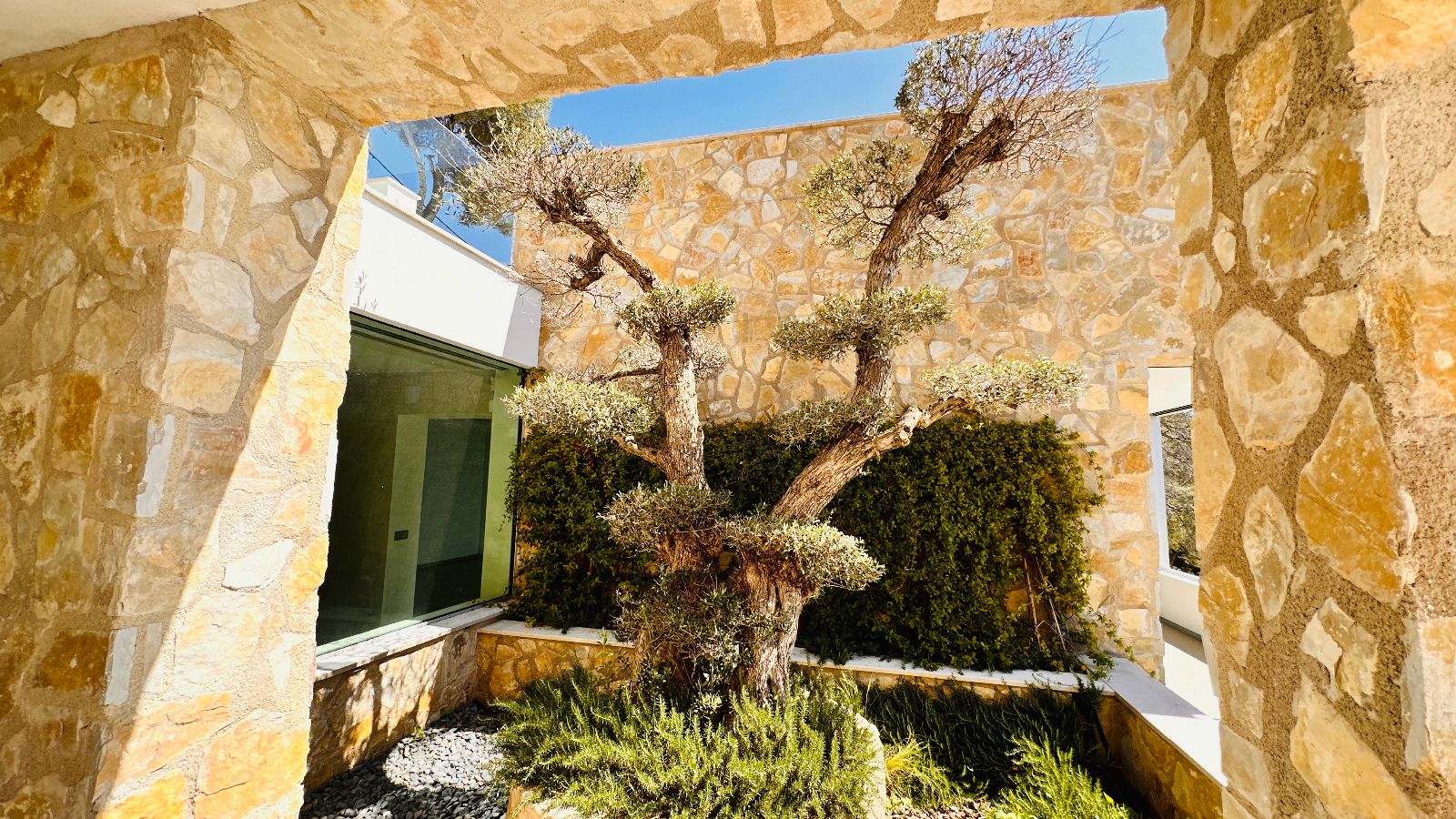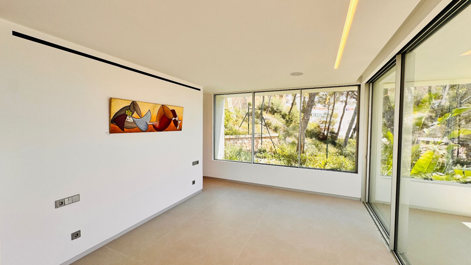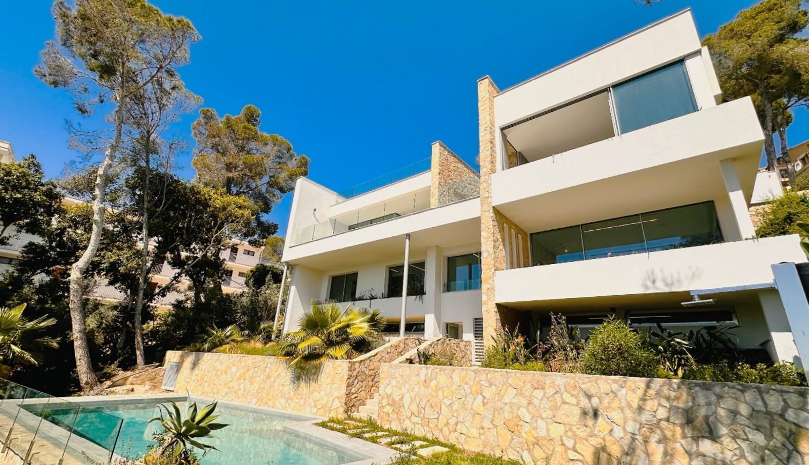 Villa de obra nueva en Santa Ponsa, distribuida en 3 niveles y 654 m2 sobre una parcela en ladera de 1.250 m2 con vistas panorámicas al mar. Esta residencia independiente ofrece una distribución con amplios espacios interiores y exteriores, incluyendo una terraza en la azotea que se extiende por dos lados con piscina, además de otra piscina de agua salada en el jardín, y 4 plazas de aparcamiento. La propiedad cuenta con un total de 4 dormitorios y 1 gran sala multifuncional en la planta inferior para gimnasio, cine privado o sala de juegos, 6 baños, salón, cocina y comedor. Está equipado con de ventanas de doble cristal y aislamiento acústico, suelos porcelánicos, ascensor, calefacción por suelo radiante, A/C por conductos con bomba de calor, ventilación avanzada con intercambio de calor y domótica.